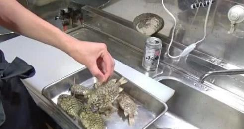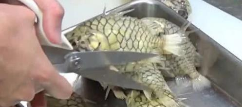 这种鱼的鱼鳞、鱼鳍都是非常坚硬的,稍不小心就会被扎伤,而且处理起来很困难。像平时去鱼鳞的方法对松球鱼来说都是不管用的,无论是用剪刀还是菜刀都无法去除鱼鳞。女子对次也是欲哭无泪。