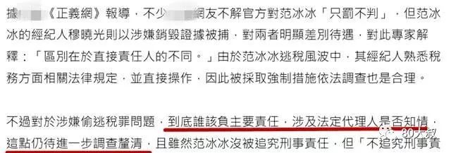 实际上范冰冰的经纪人穆晓光应该是这件事的直接责任人,范冰冰的财务都是由穆晓光负责,所以穆晓光一直被刑拘。台媒也曾报道,范冰冰案到底谁该负主要责任,目前还要进一步调查清楚,范冰冰现在还不算是全身而退。