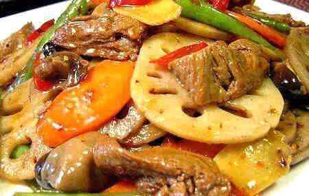 材料:莲藕1个,猪肉一块,胡萝卜,香菇,蚝油,盐,酱油,油,红辣椒,葱等