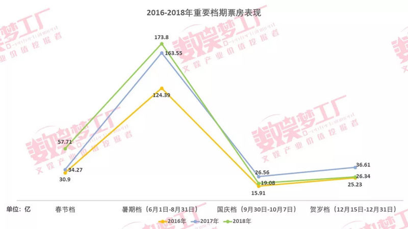 先是暑期档173.8亿元的票房成绩相比2017年仅实现了5.7%的增长,随后是跌幅近三成的国庆档,紧接着的年末贺岁档更是同比大跌10亿,票房从36.6亿元跌到26.3亿元,降幅达14.3%。