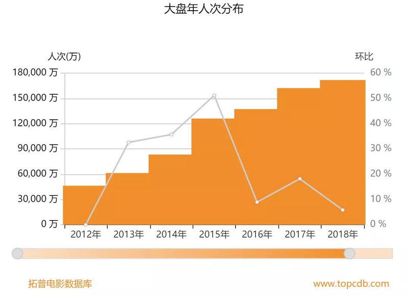 但与之相对的是观影人次增速再次掉头下滑。2018年观影人次为17.16亿,与2017年相比仅有5.93%的增长,这一增幅成为近10年最低,甚至不及2016年的增速。