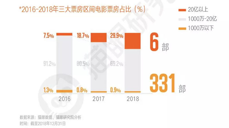 另外,5亿-10亿、3亿-5亿、1亿-3亿这三个票房区间的票房占比都出现了下降,1000万票房以下的331部影片仅贡献了0.9%票房。