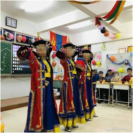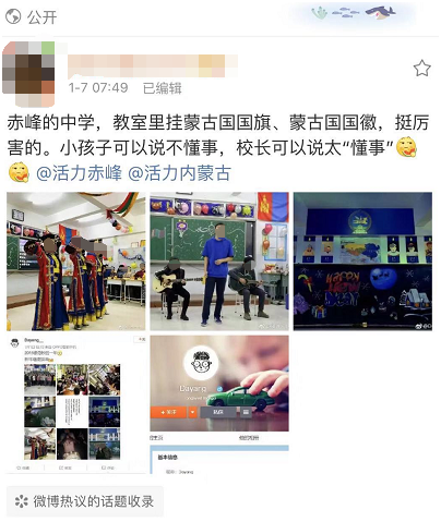 针对有微博网友爆料,内蒙古赤峰市一中学“教室里挂蒙古国国旗、蒙古国国徽”,
