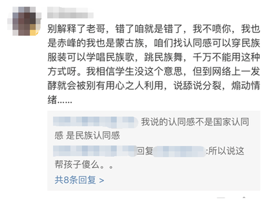 此后,有微博网友以“接受汉族教育的蒙古人”的身份做出“解释”。据该网友描述,这个活动是赤峰蒙中的元旦活动,不管是策划和教室布置都是学生自发的行为,与校方和教师们没有任何关系。该网友呼吁,不要将事件上升到分裂民族、精蒙等高度,“说真的承受不起”。