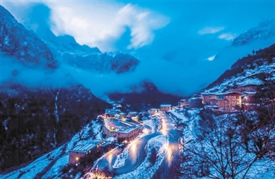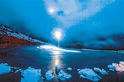 当夜幕降临,路面的灯光也随之打开。披着银色盛装的天路瞬间被点缀成一片星海,雪山上迷雾缭绕,恍惚间仿佛误入神仙圣地,神圣不可侵犯。