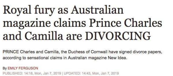 1月7日,英国《快报》转述了一则澳大利亚杂志报道的消息:一直以相爱形象示人的查尔斯王子与卡米拉已签署了离婚文件,他们最近几个月都没有在一起。该报道称,有王室内部人员透露,整个王室都知道此事,但女王命令暂对此事秘而不宣。