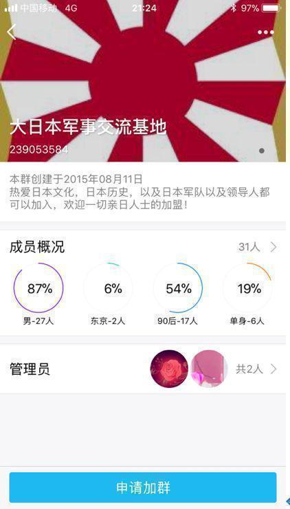 该群主的昵称也很有"特色":"樱花的决绝无人能懂"。环环点击其个人资料,发现封面有一张日本甲级战犯寺内寿一和畑俊六在徐州的合影。在另一个名为"武运长久"的群标签里,赫然有"忠诚于天皇""大东亚共荣"之类的字句。同样,环环发出的入群申请如石沉大海。研究"精日"群体多年的网友"经略幽燕我童贯"表示这很正常,因为这个圈子成员虽然遍布全国,但相对封闭,平时圈里人会主动去各大