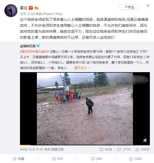 @袁立 在微博中还称,因为政府觉得是抹黑,脱贫攻坚不力,现在这位残疾老师和学生们依旧在破旧的教室上课,“新的课桌椅不让用,还每天派人监视他们。”