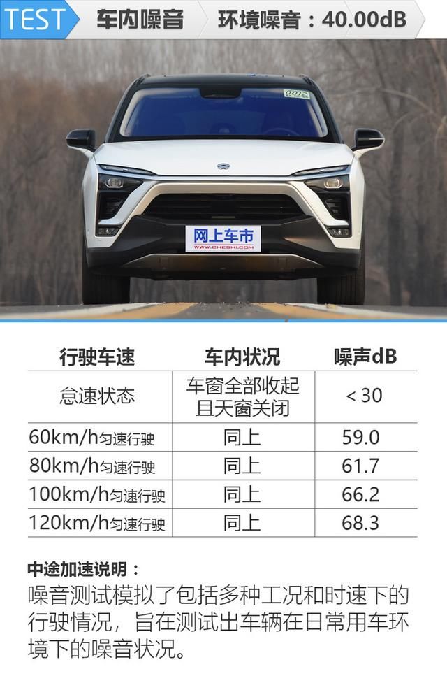 从成绩单可以看出ES8从60km/h到80km/h的噪音涨幅并不大,说明在中速行驶时ES8的NVH控制还是不错的,但是从80km/h到100km/h的过程中,噪音的涨幅较大,风噪与胎噪对于车内噪音的影响较大,毕竟ES8属于一款中大型SUV,在速度起来以后,较大的车身,固然会产生不小的风噪。