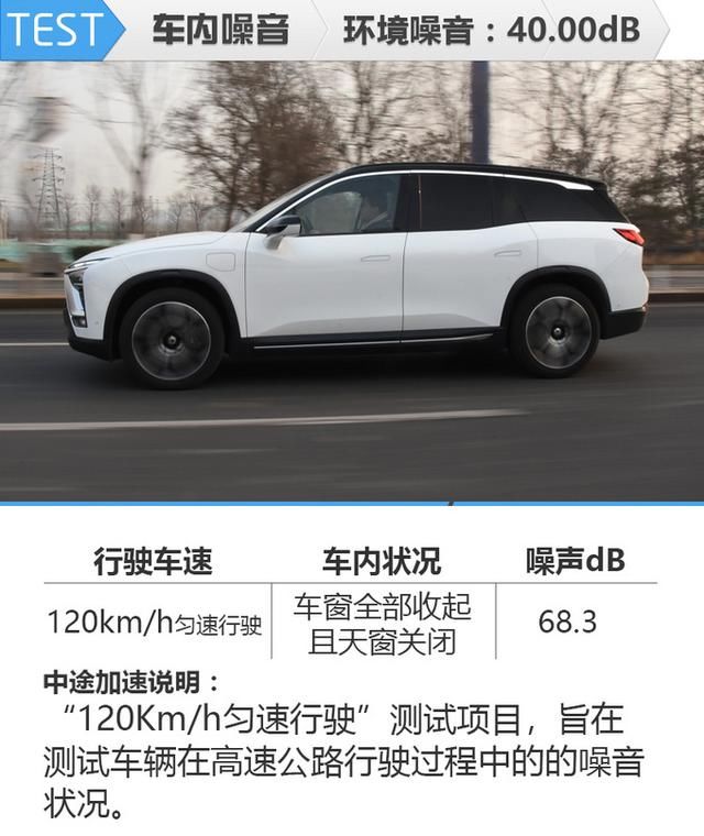 120km/h巡航是考验车辆静音性的最重要的组成部分,清华老师给我们的测试优秀标准是70dB大关,蔚来ES8的表现足矣跨入优秀行列,但是对于它高昂的价格来说,这样的表现只能说是过关,毕竟定位于豪华SUV,就要有更高的自身要求。