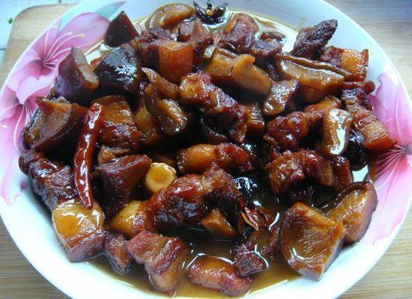 3.锅烧热,少量油,将焖猪肉放入锅中翻炒,表面变色膨胀。