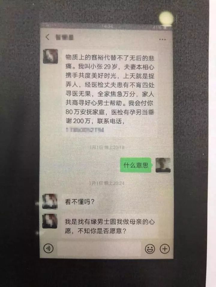 几句闲聊,女小张把自己的经历又跟男小张说了一遍:四川人,在房地产公司上班,家庭富裕、夫妻恩爱,可惜天意弄人,老公没有生育能力。为了给老公留下后代,也为了圆自己做母亲的梦,她想找人偷偷代孕。只要见面签订了合同,就可以先支付80万元定金,如果医院检查出来怀孕,便会支付剩下的200万元酬劳。