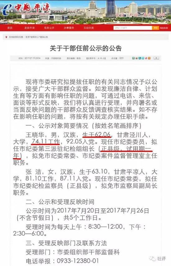 2017年,甘肃平凉市政府官网公示了拟提拔干部王晓华的信息,他1962年6月出生,1974年11月参加工作。
