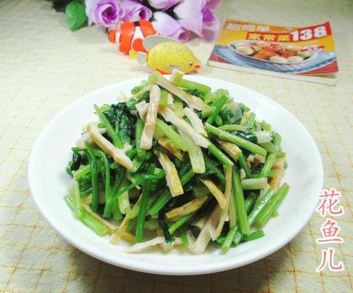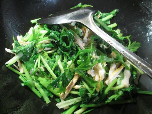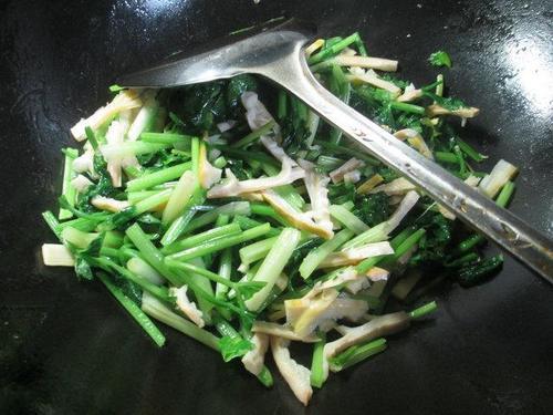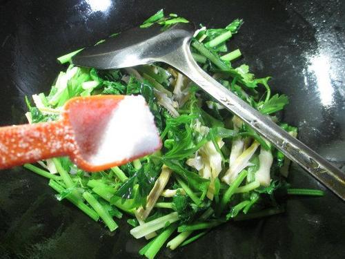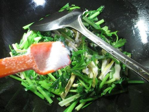 芹菜 200克、羊尾笋 110克、花生油 3汤勺、精盐 少许、味精 少许