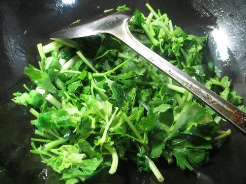 3.烧锅加3汤勺油烧热,下入切好的芹菜翻炒翻炒。