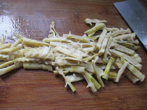 2.将羊尾笋撕成丝放在案板上切成段,待用。