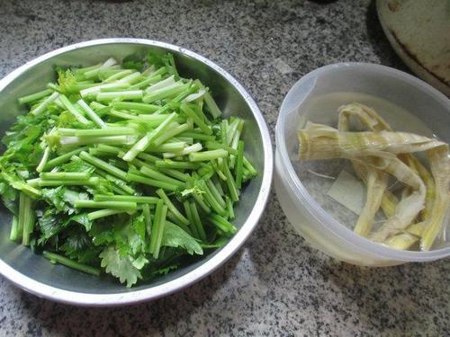 1.食材:芹菜(已去根清洗切段)、羊尾笋(已浸泡抽去一部分盐分)