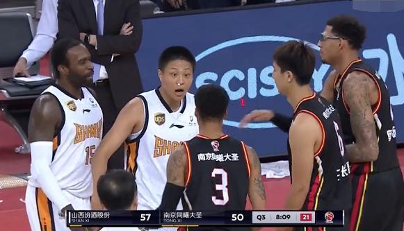 而之前的两次犯规显然激化了双方球员的矛盾,火气也越来越大,彼此之间的较劲儿动作不断出现,第三节比赛哨声响起后同曦队买尔丹手指山西队邢志强说着什么,这也惹恼了邢志强,邢志强直接冲了过去推了买尔丹一把,而此时其他球员也迅速围了过来,二人冲突有进一步升级的可能,裁判员赶紧过来平息事端,而由于第三节比赛刚好已经结束,双方替补席多名球员都冲了进来,场面一度非常混乱,还好二人被及时拉在了两端,不过吃了亏的买尔丹还不断地对着邢志强叫骂着。