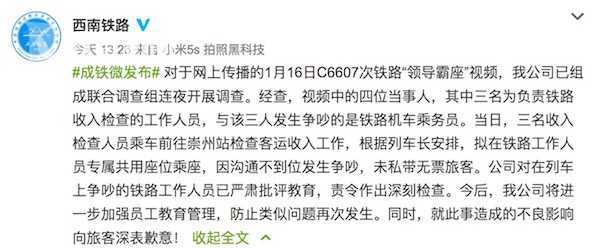 17日13点26分,@西南铁路回应:对于网上传播的1月16日C6607次铁路“领导霸座”