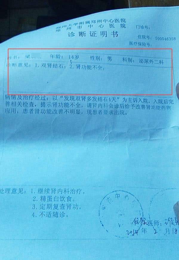但在2014年,梁宏又被查出肾病。其提供的病例资料显示,2014年2月,14岁的梁宏被郑州大学附属郑州中心医院诊断为“双肾结石;肾功能不全”。