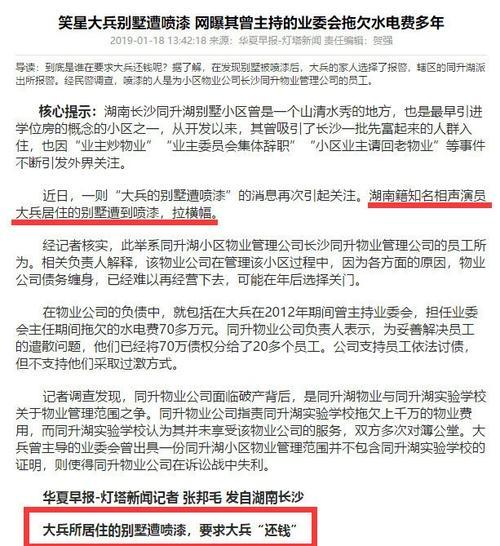 报道,“笑星大兵别墅遭喷漆,网曝其曾主持的业委会拖欠水电费多年”,具体原因也是非常复杂,大兵在