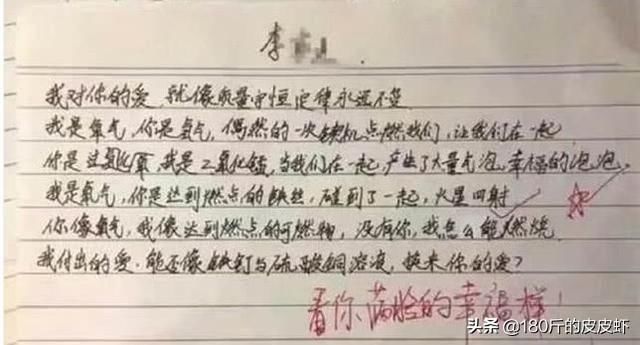 这封情书运用到了化学知识,浅显易懂,连小果这种学渣都看得懂,相信其他人也没问题,看时看得懂,写不写得出来又是另外一回事了。这封情书可是男同学熬夜写出来的呢!十分有创意,一字一句都流露出这个男生对那个女生的喜爱之情。老师看了之后也很满意,写下评语:看你满脸的幸福样!