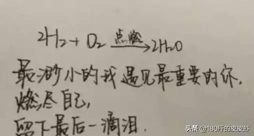 这封情书运用到了化学知识,氢气加氧气,被点燃后,就变成了水,这位同学把自己喜欢的人比喻成生命中最重要的东西,氧气。最后燃尽自己,只留下最后一滴泪。看起来很伤感。