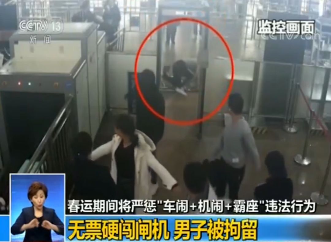 在广西北海火车站,也有一名男子因为扰乱车站秩序被拘留。监控中这名身着灰色上衣的男子不顾民警劝阻,在无票的情况下硬闯闸机,翻越围栏闯入了车站候车室。