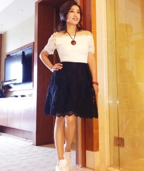 一字肩设计的白色的上衣下身穿着一件黑色的蕾丝质感短裙,简单时尚的黑白配色,短裙配一字肩的上衣甜美又性感,脚上依然踩着一双小白鞋,好像瞬间暴露出着装者的少女心,也是十分减龄的,从以上的穿搭我们不难看出其实刘晓庆的心理年龄与实际年龄相比还是更年轻的,看起来原来年轻的妆容+年轻的穿搭都没有年轻的心态重要。