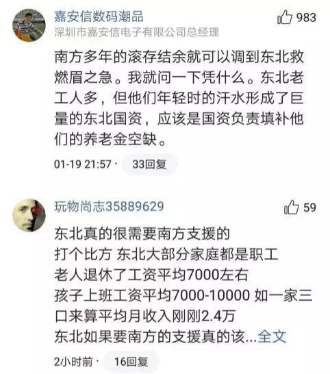 也有网友认为:东北老工人多,但他们年轻时的汗水形成了巨量的东北国资,应该是国资负责填补他们的养老金空缺。