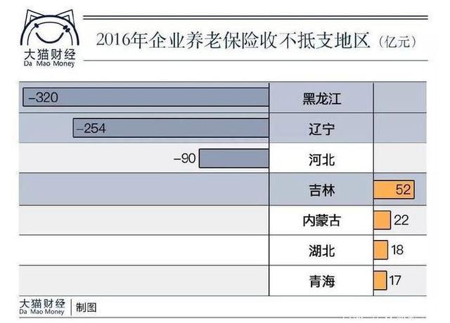 2016年,东北三省的养老金结余齐刷刷为负。除了黑龙江的-320亿元,辽宁的结余-254亿元,吉林则-52亿元。