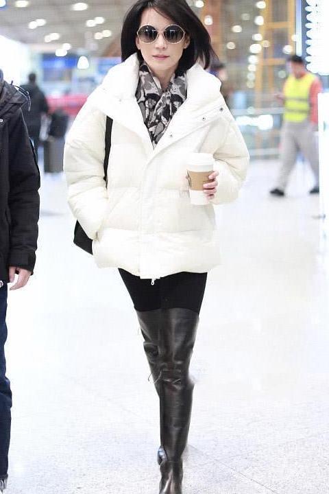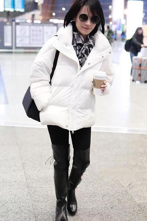 不得不说俞飞鸿真的很会穿,对于自己的风格实在是太了解了,羽绒服和长筒靴的搭配,让她看起来成熟又迷人,漆皮的长筒靴带着时髦的气息亮点十足,加上她温柔的笑容,优雅女人的称号非俞飞鸿莫属!