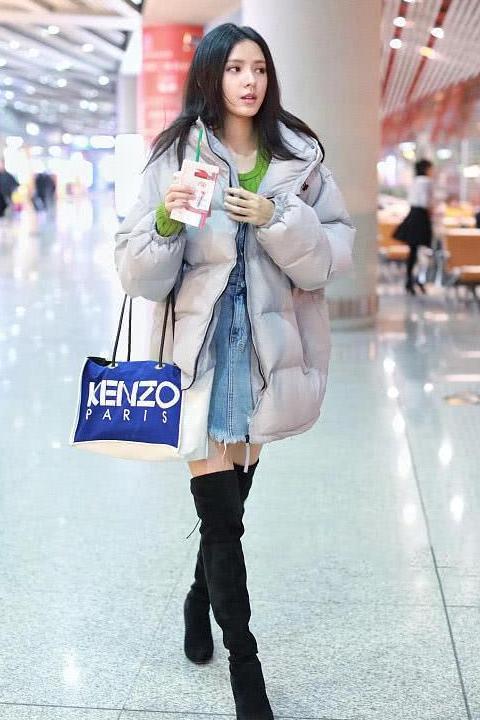 张予曦身穿简约的灰色羽绒服,搭配上牛仔半身裙,彰显出青春的气息,搭配上显瘦的黑色长筒靴完美的展现出她的好身材,手上拎着LOGO单肩包很有街头的时髦感。