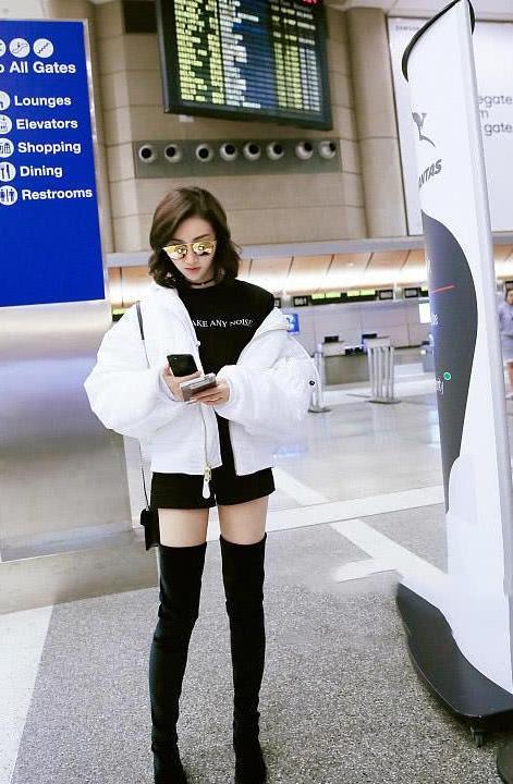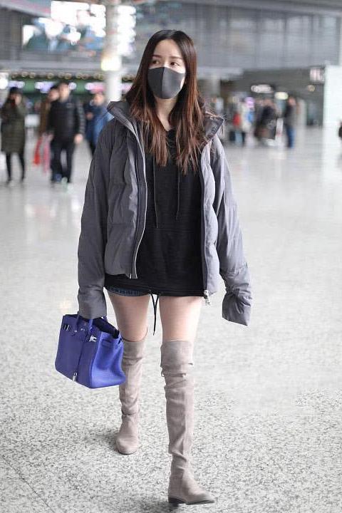 娄艺潇短款的羽绒服内搭一件黑色的卫衣,清新又休闲穿上短裤打造出下半身失踪的性感吸睛度满满,一双灰色的系带长筒靴让她散发出满满的女人味,手上拎着宝蓝色的包包,优雅感十足!