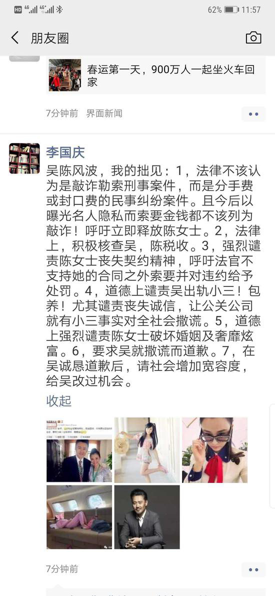 吴陈风波,我的拙见:1,法律不该认为是敲诈勒索刑事案件,而是分手费或封口费的民事纠纷案件。且今后以曝光名人隐私而索要金钱都不该列为敲诈!呼吁立即释放陈女士。2,法律上,积极核查吴,陈税收。3,强烈谴责陈女士丧失契约精神,呼吁法官不支持她的合同之外索要并对违约给予处罚。4,道德上谴责吴出轨小三!包养!尤其谴责丧失诚信,让公关公司就有小三事实对全社会撒谎。5,道德上强烈谴责陈女士破坏婚姻及奢靡炫富。6,要求吴就撒谎而道歉。7,在吴诚恳道歉后,请社会增加宽容度,给吴改过机会。
