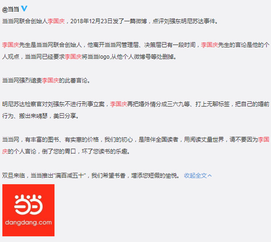 此前,当当网联合创始人李国庆在 2018 年 12 月 23 日发文点评刘强东明尼苏达事件,引发了争议。对此当当表示,强烈谴责李国庆的此番言论,并要求其删除微博号等头像上的当当 logo。