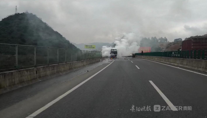 经一路三方核实,发生燃烧的车辆是从广东往昆明方向行驶,车上载客 57 人,驾驶员发现车辆发生燃烧后第一时间靠边停车打开车门,组织乘客疏散,由于发现和疏散及时,车上乘客