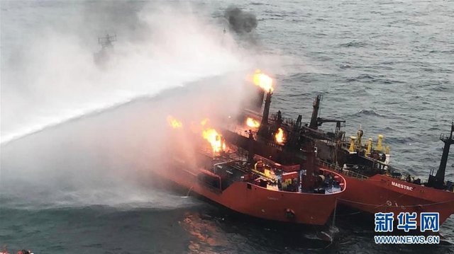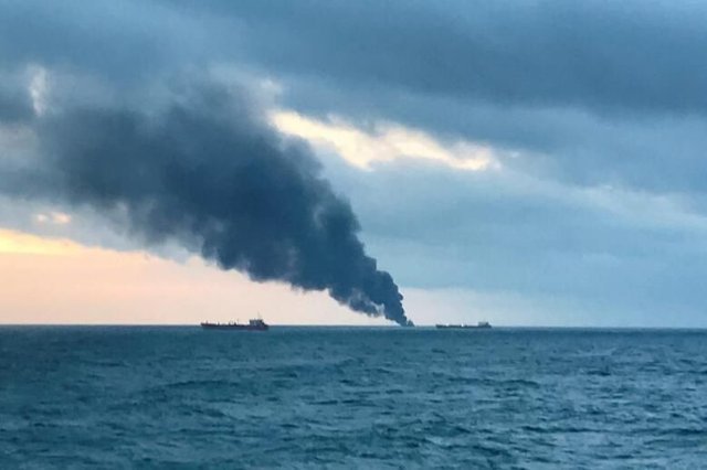这是1月22日在刻赤海峡附近水域拍摄的起火货轮。 俄罗斯联邦海洋和河流运输局22日表示,21日在刻赤海峡发生的货轮起火事故中的失踪人员已无生还希望。