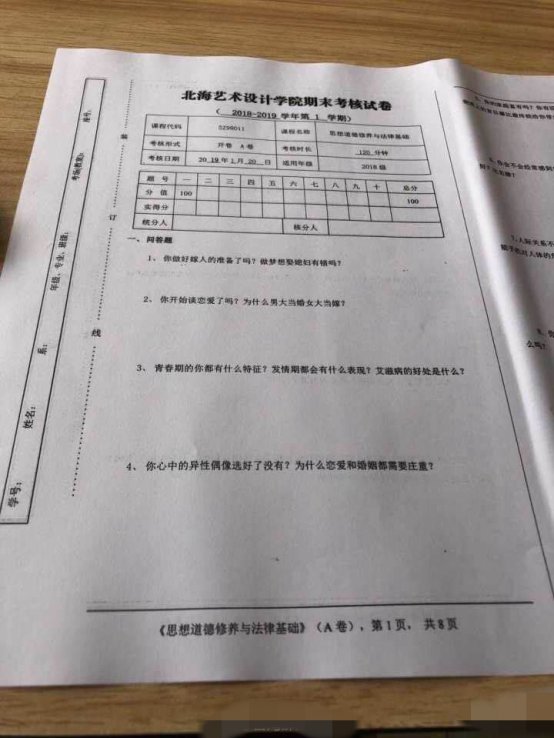 相关图片显示,被网友曝光的试卷抬头为“北海艺术设计学院期末考核试卷 (2018-2019学年第1学期)”,该卷的考核日期为2019年1月20日,适用年级为2018级,考核课程名称为“思想道德修养与法律基础”。同时,被曝光的另一份试卷考核日期同为2019年1月20日,适用年级为17级,考核课程名称为“毛泽东思想……理论体系概论”。