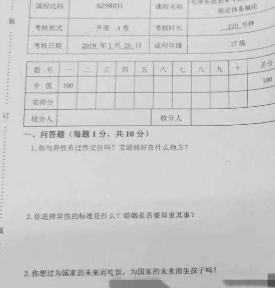 报道)1月20日,有网友爆料称,在位于广西北海的北海艺术设计学院当天举行的思政课期末考试试卷中,出现了“你与异性有过性关系吗?”“你要不要借一个好的种?”“女孩子知道自己是‘肉’吗?”等与课程内容无关、令人匪夷所思的试题内容。1月21日晚,广西壮族自治区教育厅就此事回应称,已注意到该事件,并已派出调查组到学校开展核查,相关情况经核实后再做进一步通报。