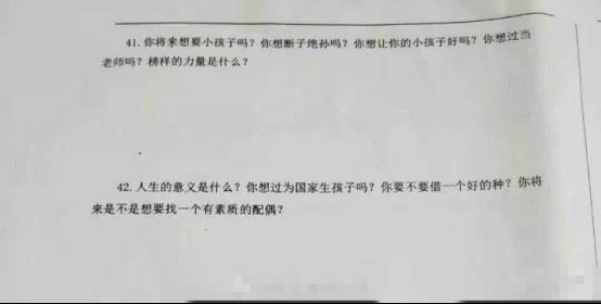 记者注意到,在相关试卷中有多道问题尺度惊人、令人匪夷所思,如: