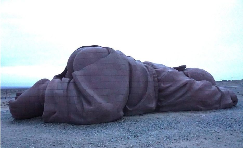 其实这个巨婴并非真人,而是一件雕塑品,这个雕塑位于甘肃省瓜州县红山坡,这里有一片茫茫的戈壁滩,很少有人会来到这里,而这个巨婴就在无人打扰的环境中静静的熟睡,它伏着身子撅着屁股好似正在美梦之中。
