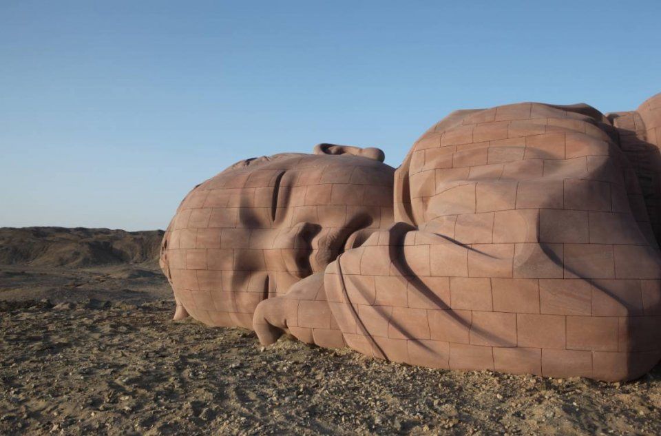 巨婴雕像被称为“大地之子”,其长度达到了15米,宽度4.5米,也有9米之高,使用了3D打印技术将红砂岩一块一块的拼接组装而成,其设计者董书兵教授是清华大学美术学院雕塑系的主任,他希望通过这种方式让这片孤寂的沙漠重新散发活力,让人与自然能够和谐共处,不过可惜的是由于当地人烟稀少而且值得游览的景色不多,因此这座雕像并没有吸引太多的游客前来观赏,反而来过这里的游客表示都很心疼,由于环境的衬托这个“婴儿”仿佛脱离了人类社会,这也让游客们都从这座雕像中感受到了孤独。