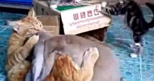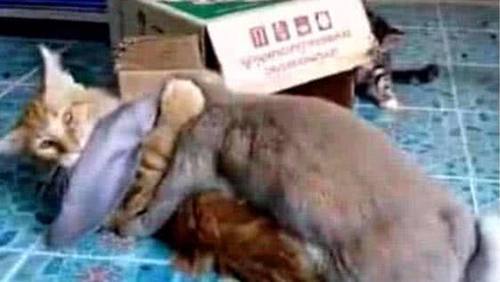 兔子一向胆子小,战斗力几乎为零,但现在居然把橘猫打的毫无招架能力,只能说兔子急了真的是会咬人的,而网友们看完直呼辣眼睛,猫竟然还打不过兔子,还有那只虎斑猫也太猥琐了,差点笑出猪叫~