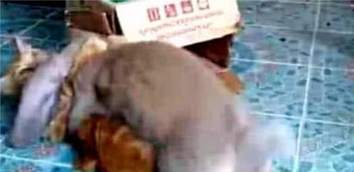 这天半夜,女孩正睡的香甜,突然听到一阵阵什么动物在嚎叫,仔细一听好像是橘猫,女孩吓的一骨碌爬起来,跑到客厅打开灯一看,眼前一幕让她惊呆了,原来那只兔子不知道怎么跑出了笼子,和橘猫打起来了,最让她惊讶的是兔子竟然骑在橘猫身上,橘猫被摁在地上打,而虎斑猫则偷偷躲在角落里隔岸观火。