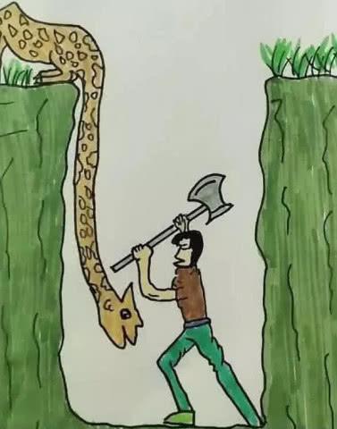 4、图中的一个男子砍柴掉进了坑里,长颈鹿伸下脖子到洞里想让他上来,可是男子以为长颈鹿在伤害他,就准备用斧子去伤害长颈鹿,现实中有很多这样的人,把别人对他的好当做是一种伤害。