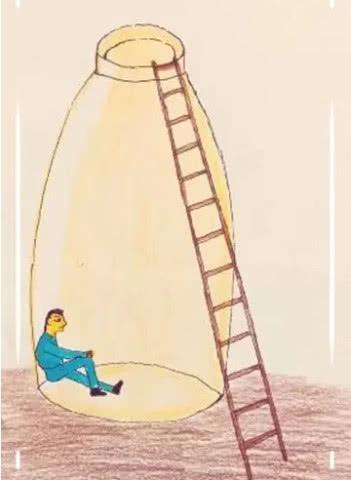 3、那这个图上我们看到的是一个人,被困在了一个很大的瓶子里边,在瓶子的外边有一个梯子,她可能通过这个梯子爬了进去,但是却被困在里边出不来了,所以说人在最高处的时候,反而是你最困难的时候,因为你再也看不到,远处的风景了,只能活在自己的世界里边,觉得更加的孤单了,高处不胜寒。