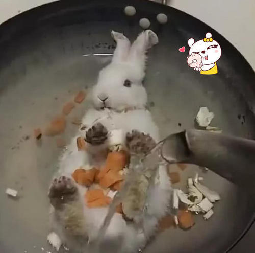 当时主人看到了之后就大发雷霆,当着兔子的面非常的生气的放在了锅里,当时兔子看到了这样的情形之后脸上露出了一副很严厉的表情,当时还很僵硬的把头盯着主人看 ,仿佛在告诉主人,饶了我吧?