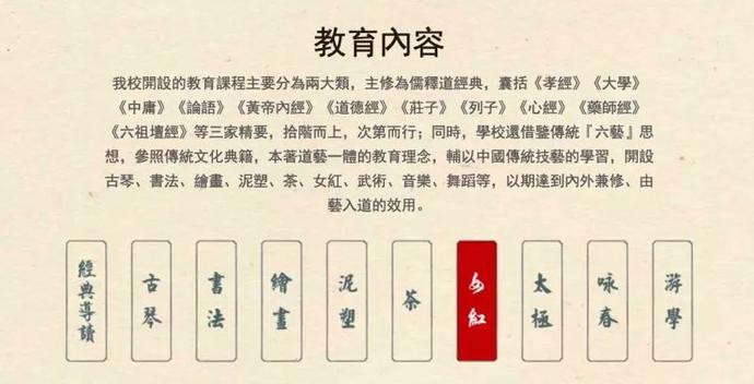 “暑期班每年都能有二三千人报名,最后能上课的有800人左右,不超过1000人。”上课内容主要集中于诸子百家等经典课程,以及书法、古琴、茶道、女红、舞蹈、武术和太极等艺术课程。