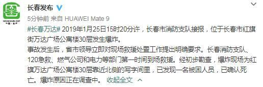 事故发生后,省市领导立即对现场救援处置工作提出明确要求。长春消防支队、120急救、燃气公司和电力等部门第一时间到场救援。经初步勘查,爆炸现场为红旗万达广场公寓楼30层靠近北侧的写字间里,已发现一名被困人员,已确认死亡。爆炸原因正在调查中。